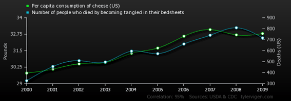 Veamos otra: cuya correlación es mucho más impactante, aunque igual de absurda. ¿Sabías que mientras más aumenta el consumo de queso en Estados Unidos más aumenta la cantidad de gente que muere enredada en sus propias sábanas? Es más, ¿sabías que hay gente que muere enredada en sus propias sábanas? Será por el queso