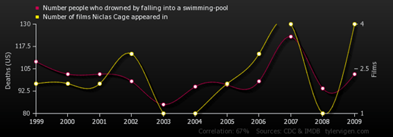 ¿Sabías que hay una correlación entre la cantidad de películas que protagonizó Nicholas Cage y la cantidad de personas que se ahogaron en una piscina? El gráfico es más que evidente.